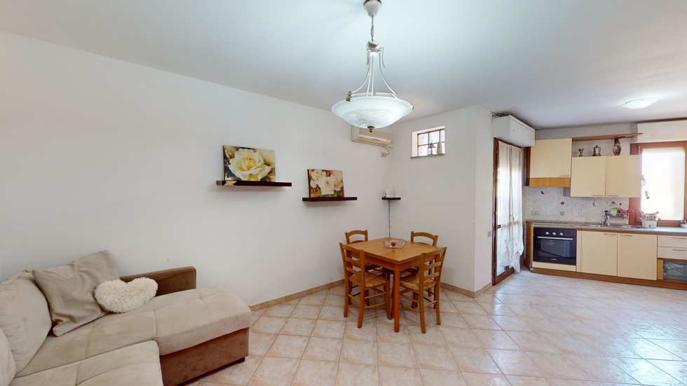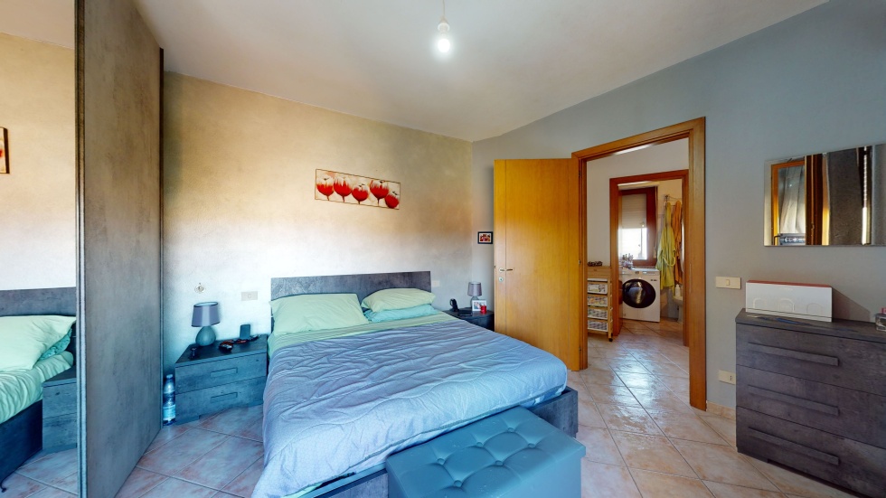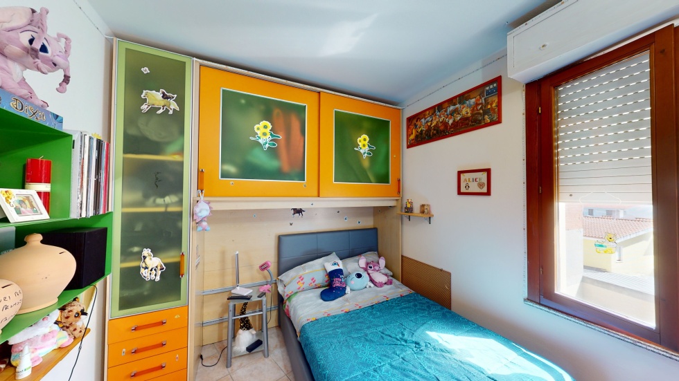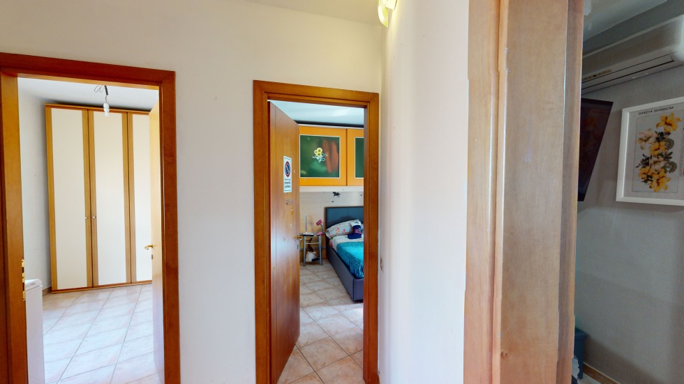 Appartamento collocato al secondo ed ultimo piano, sovrastato dal lastrico solare di proprietà, e caratterizzato da un salone con angolo cottura avente affaccio diretto sul balcone a giro, disimpegno ampio, bagno con vasca, camera matrimoniale con balcone e due camere singole, una delle quali con accesso al balcone a giro.